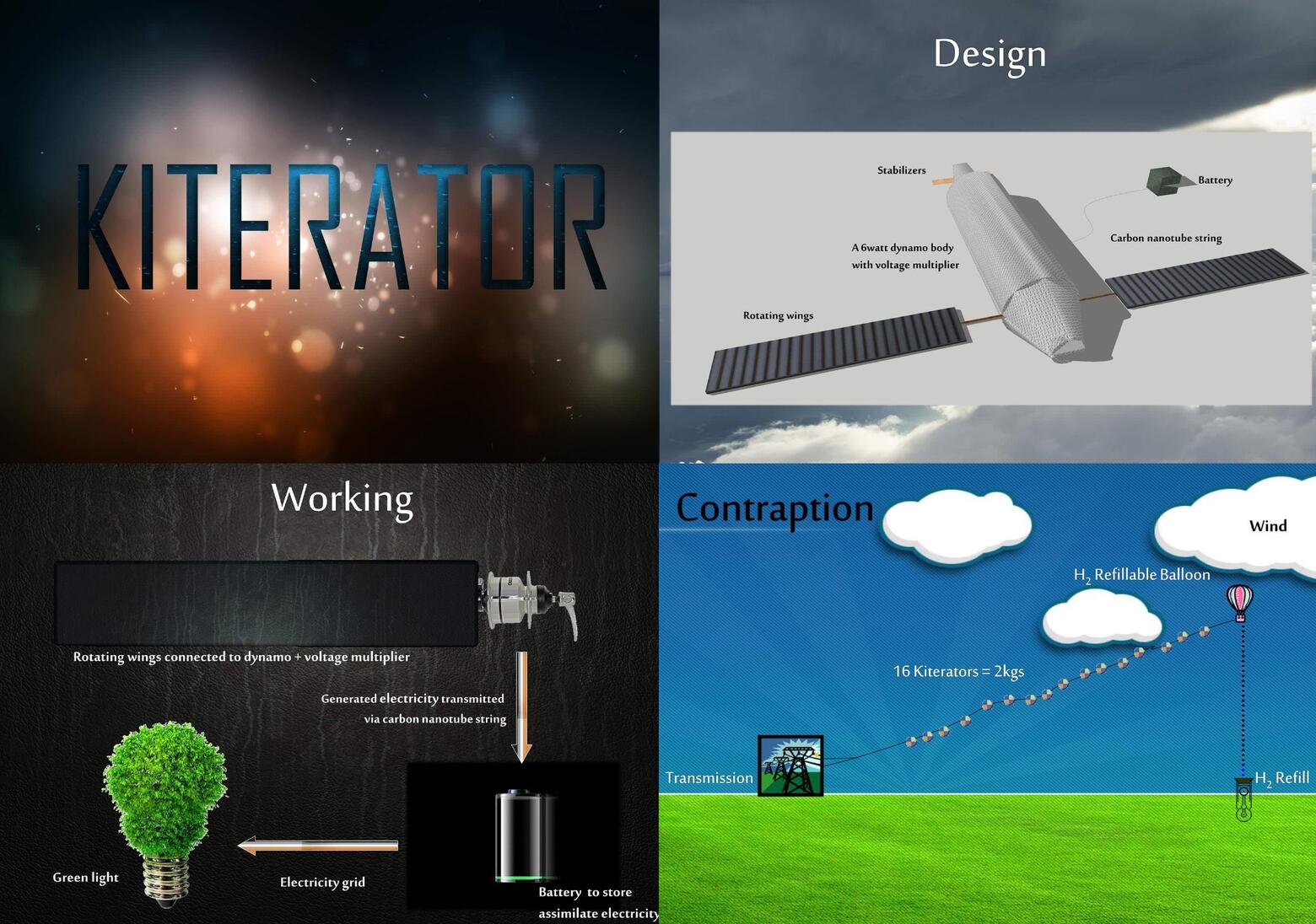 A Kiterator as shown above; is a contraption of wings, carbon nano tube strings, dynamos, batteries and a few other components.